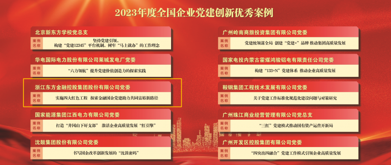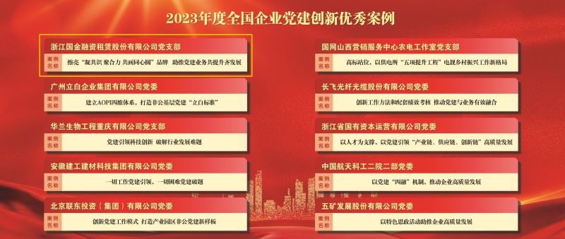 7月22日,2023全國企業黨建(案例)研討會暨第三屆企業黨建創新優秀案例發布儀式在北京舉辦。會上,浙江東方黨委《實施四大紅色工程 探索金融國企黨建助力共同富裕新路徑》黨建案例成功入選“2023年度全國企業黨建創新優秀案例”,并作為12家優秀企業之一,受邀在研討會上作典型經驗交流。旗下國金租賃支部黨建品牌“凝共識 聚合力 共畫同心圓”入選“2023年度全國企業黨建優秀品牌”。